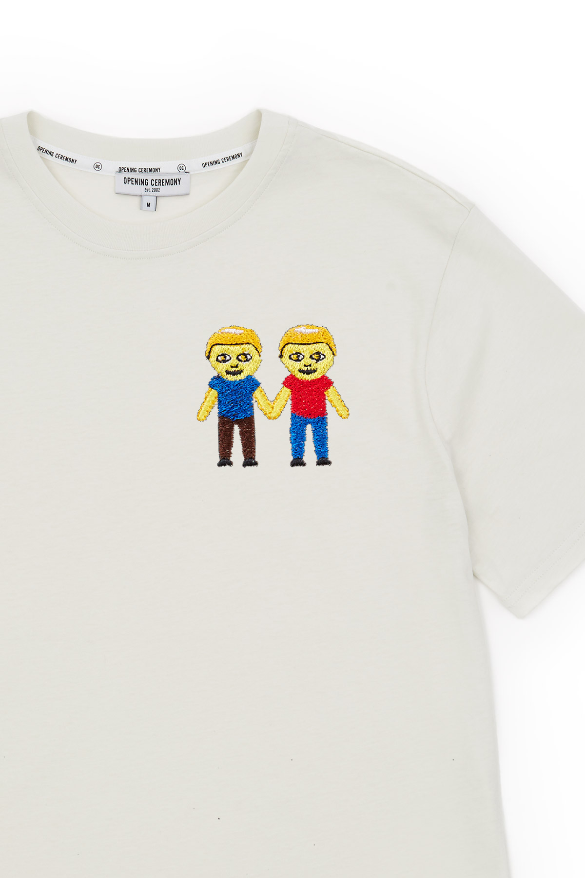 Ahora bien, por mucho que lo dicho hasta este momento parezca extremadamente sencillo, resulta que al final todo el minimalismo de la puesta en escena queda revolucionado por una apuesta igual de mínima pero altamente cachonda y estéticamente impecable: en el lateral izquierdo del pecho (ya tú sabes: donde está el corazón) va bordado un emoji con fuerte aroma LGBTIQ. Ahí están las parejas de emojis hombres y mujeres dándose la mano, pero también el arco iris y los zapatos de tacón. Ojito también con las palabras bordadas (Dad y Proud, además de una rúbrica en la que se lee «life is equal«) y con otras extravaganzas como el castor o el propio nombre de la firma, Opening Ceremony, rodeado de corazoncitos.