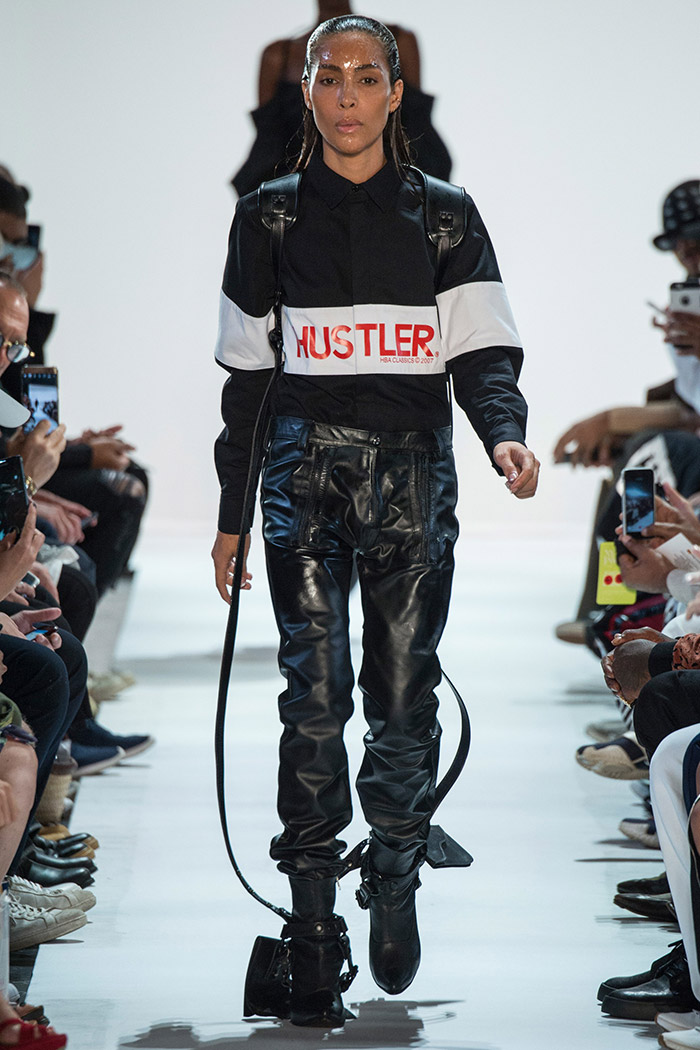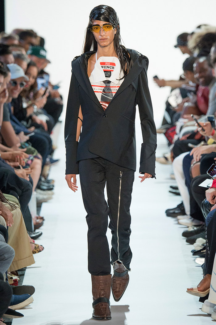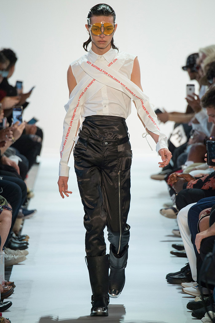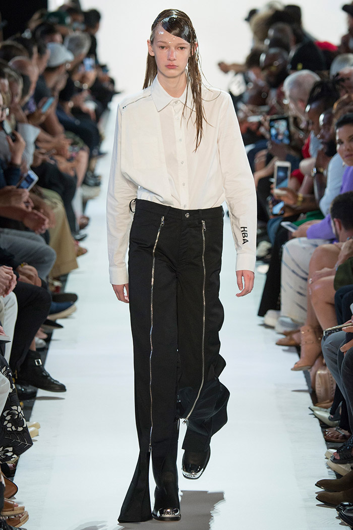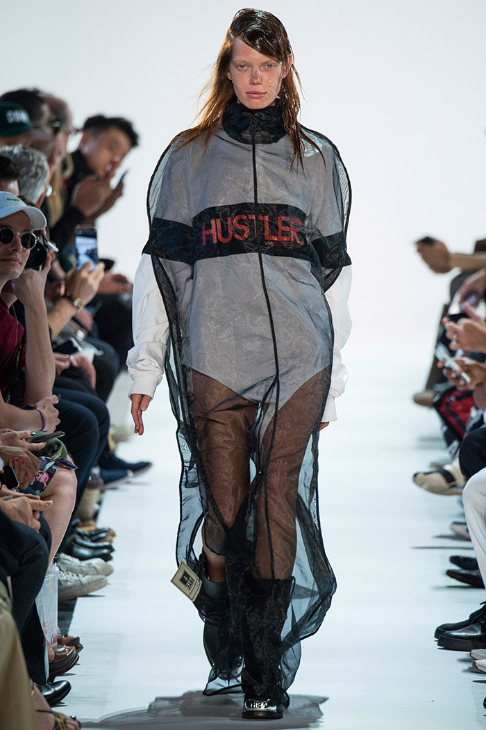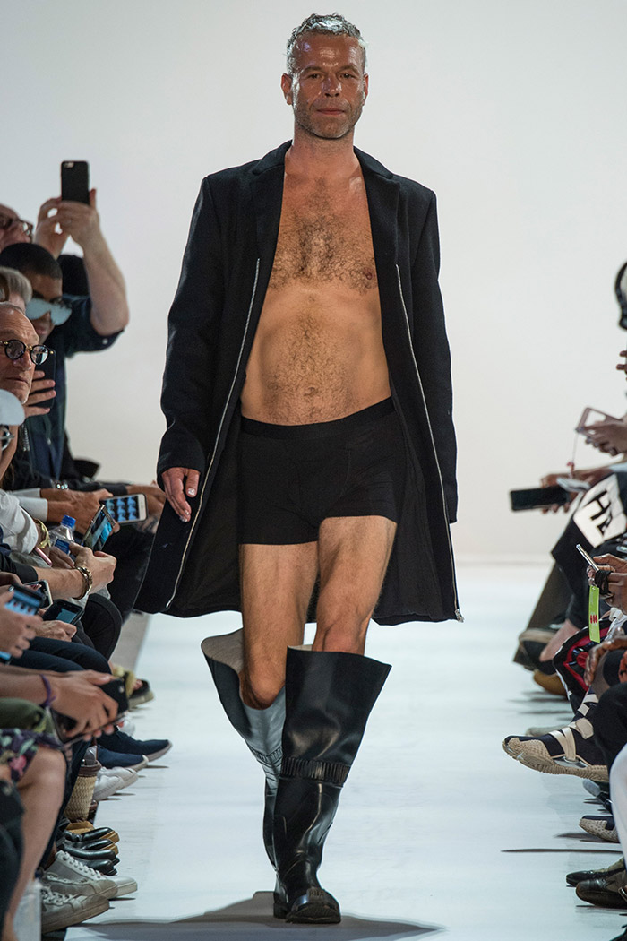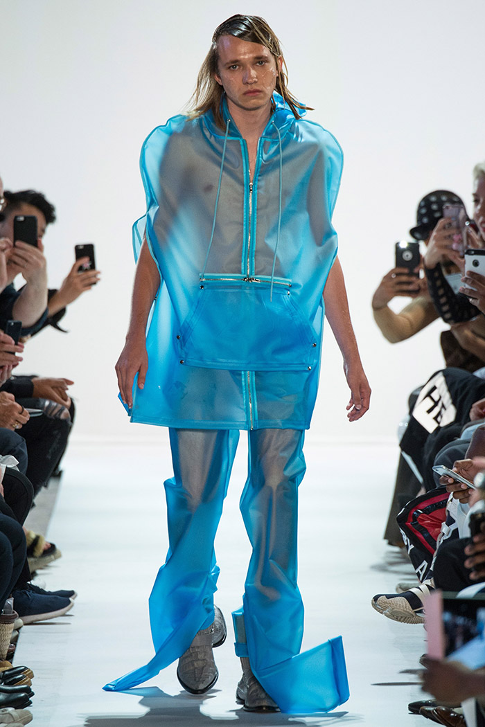 Por lo demás, la colección para la próxima primavera / verano 2017 de Hood by Air no podía ser más Hood by Air. Vuelve a estar presente la deconstrucción del patronaje clásico y, sobre todo, esa sensación de que Oliver se lo toma todo a pura chanza. ¿Cómo interpretar si no las botas camperas con doble puntera? ¿Y la ropa todavía en sus perchas? ¿Y los diferentes claims anti-puritanos? ¿Y la presencia del artista y fotógrafo Wolfgang Tillmans como modelo semi-desnudo vistiendo unas botas de pesca?