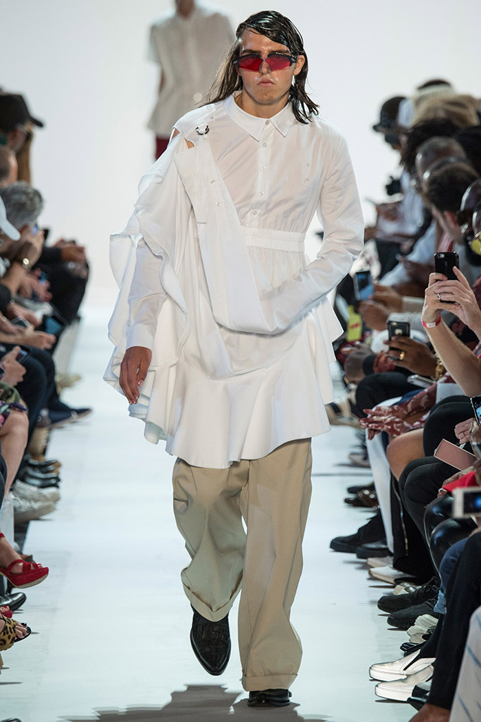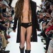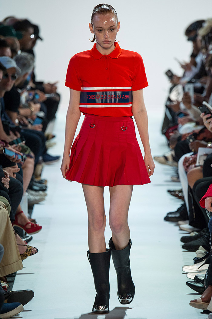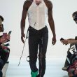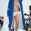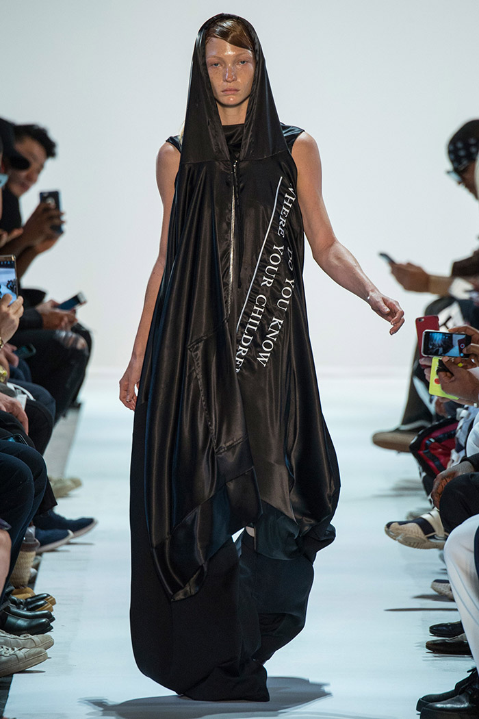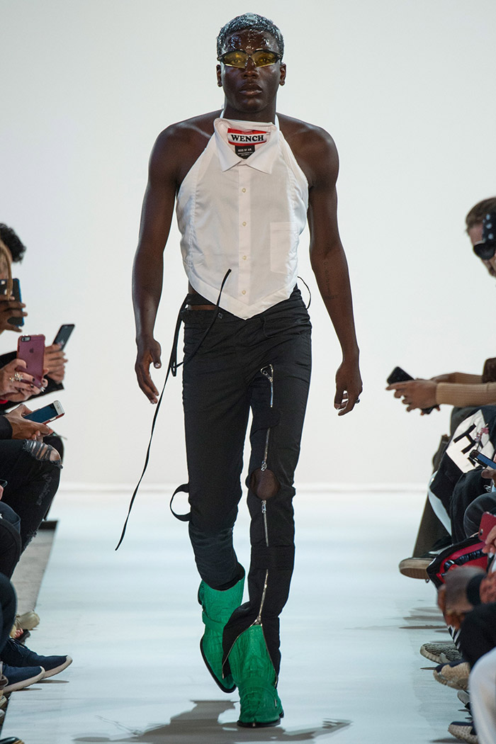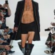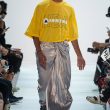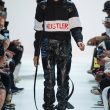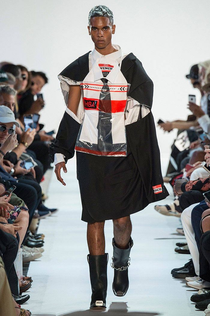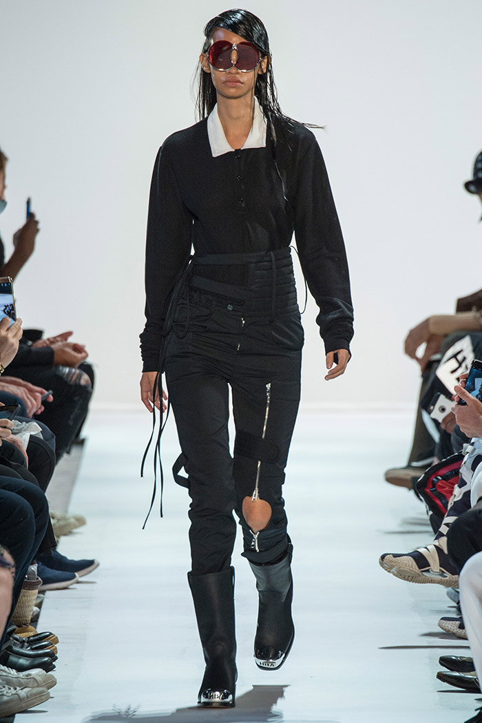Por lo demás, la colección para la próxima primavera / verano 2017 de Hood by Air no podía ser más Hood by Air. Vuelve a estar presente la deconstrucción del patronaje clásico y, sobre todo, esa sensación de que Oliver se lo toma todo a pura chanza. ¿Cómo interpretar si no las botas camperas con doble puntera? ¿Y la ropa todavía en sus perchas? ¿Y los diferentes claims anti-puritanos? ¿Y la presencia del artista y fotógrafo Wolfgang Tillmans como modelo semi-desnudo vistiendo unas botas de pesca?