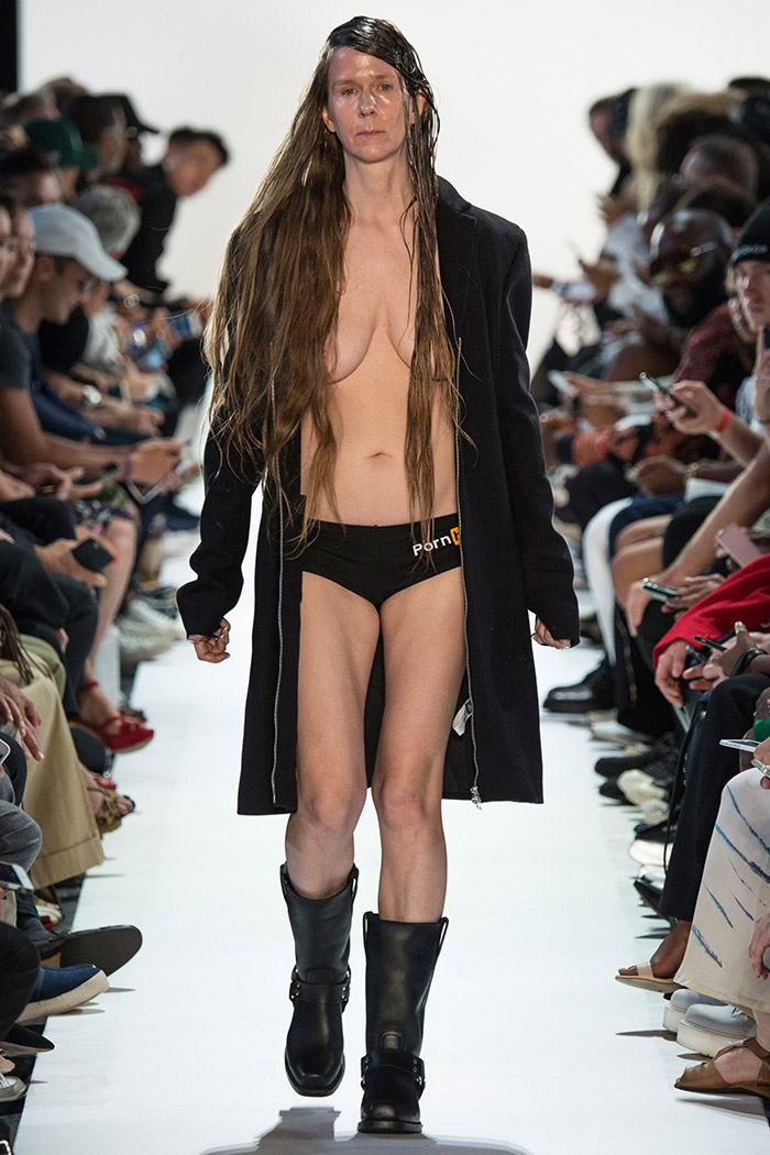Pero ha sido estos días cuando Oliver ha vuelto a poner a todo el mundo en su sitio. Y lo ha hecho donde un diseñador tiene que hacerlo: sobre la pasarela de la New York Fashion Week. Para empezar, desde hace un tiempo se sabía que Hood by Air había establecido una extraña alianza con un «partner in crime» para este desfile: ni más ni menos que PornHub, el archiconocido portal de porno online… Pero lo que nadie esperaba (¿o sí?) es que la presencia del porno se hiciera tan sumamente explícita.