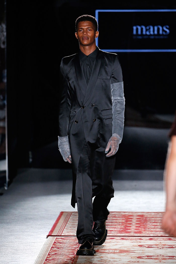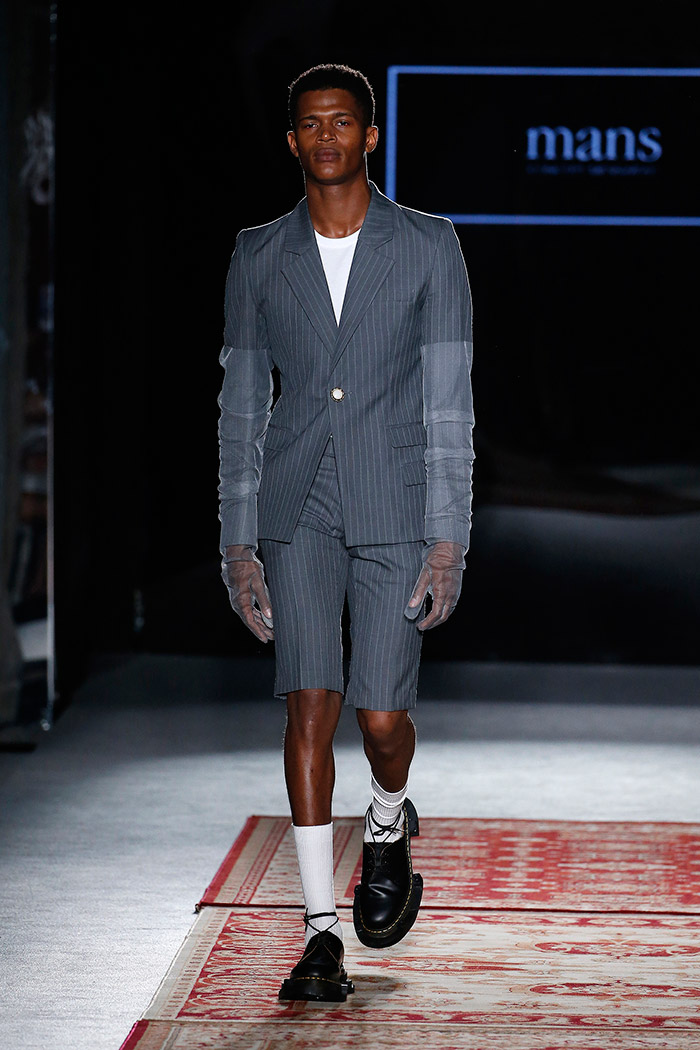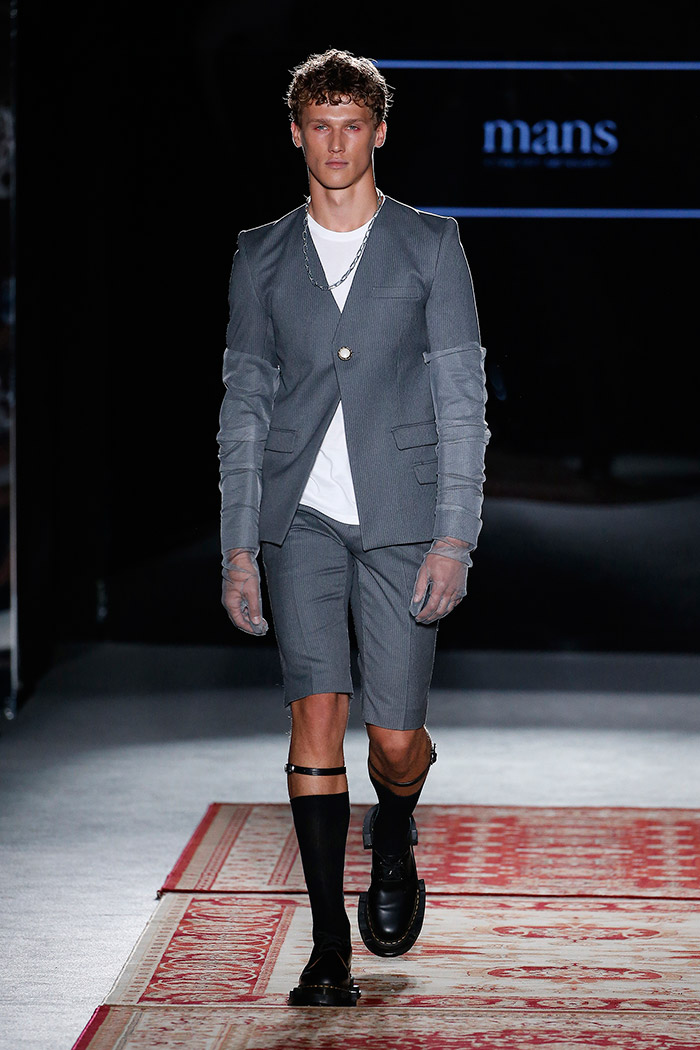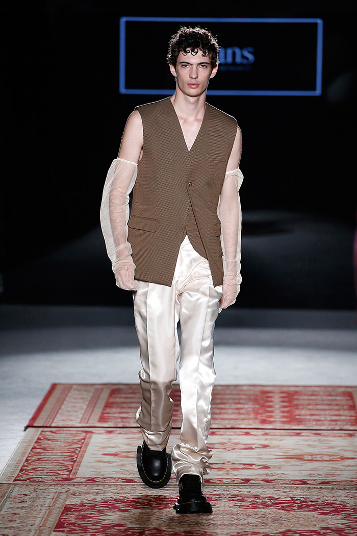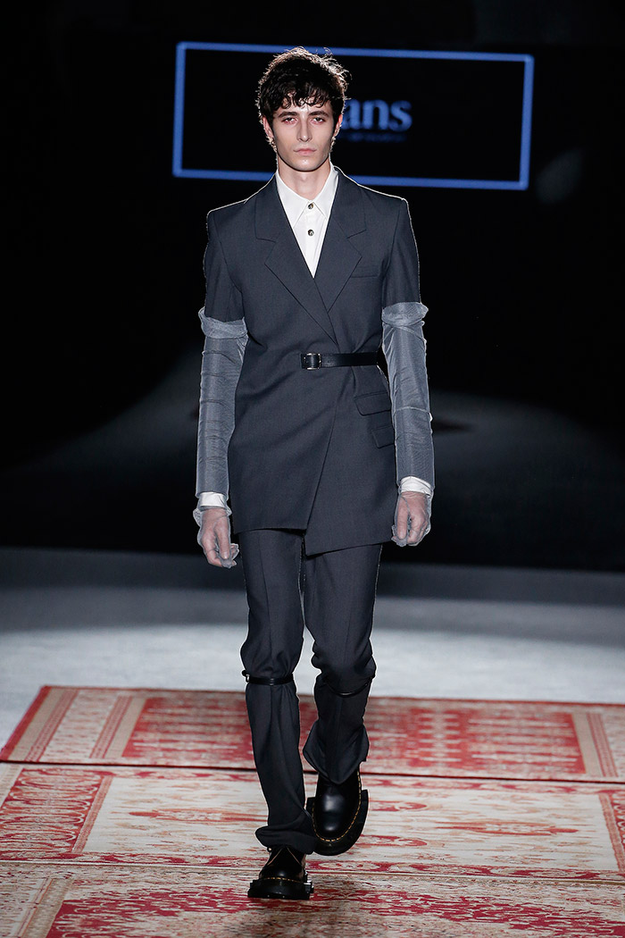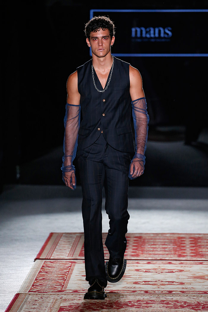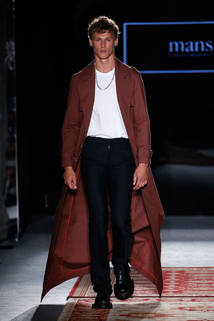 El rastro de las raves queda en el maquillaje en los ojos enrojecidos de los modelos pero, en lo concerniente a este uniforme clubber, la base primordial es la sastrería en una aproximación que toma a Thom Browne y sube las apuestas por la vía de la liberación del formato tres piezas habitual en el traje: aquí un «traje» puede vestir sin necesidad de chaqueta, substituyéndola por un chaleco en versión maximalista o por una camiseta sin mangas que conserva el alma del traje simple y llanamente en el tejido. Las prendas de punto y de sporstwear aparecen en la colección como puntos de fuga que incluso dejan a la vista partes desnudas del cuerpo masculino. Los abrigos de Mans Concept & Menswear llegan hasta el suelo y caen con una feminidad que se introduce en el resto de la colección como un virus empeñado en socavar la masculinidad del siglo XX y abrirle paso hacia el siglo 21.