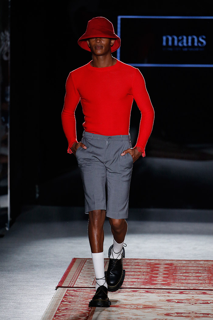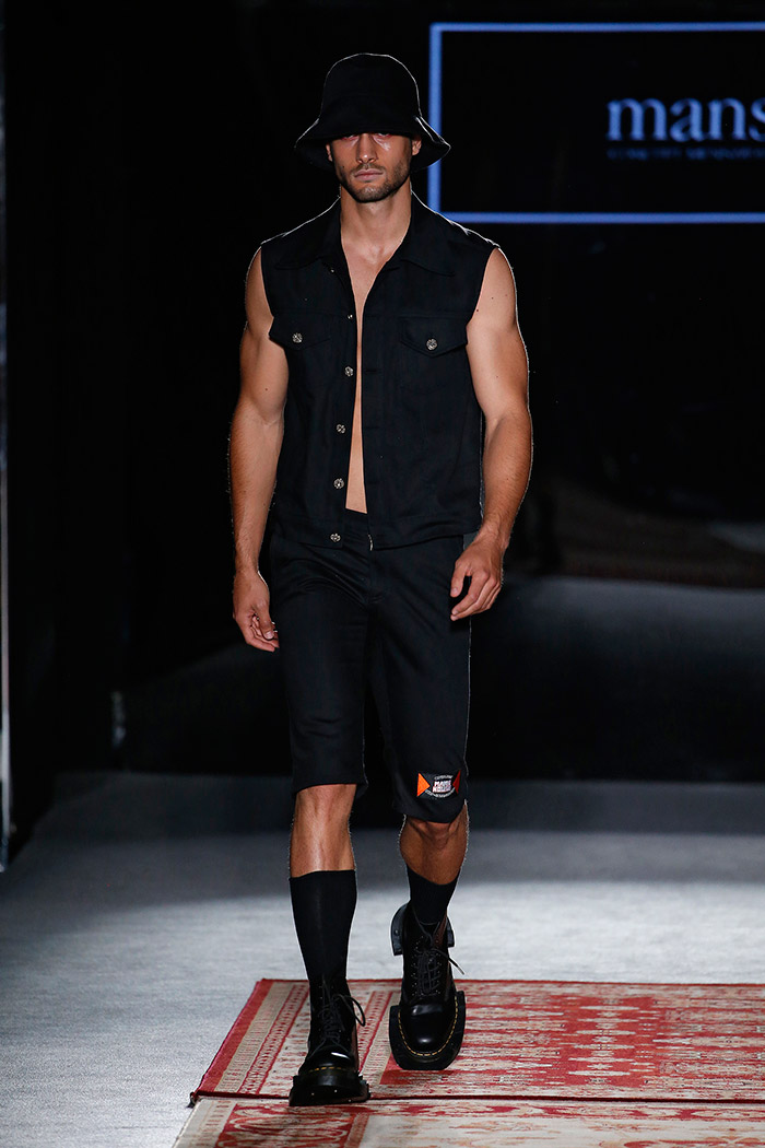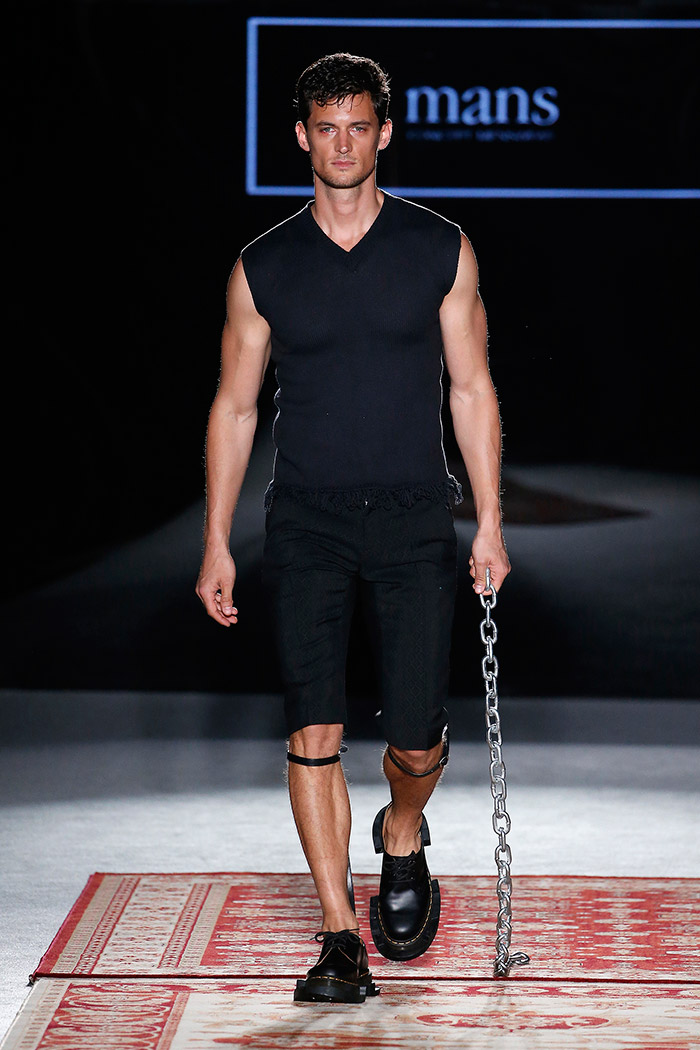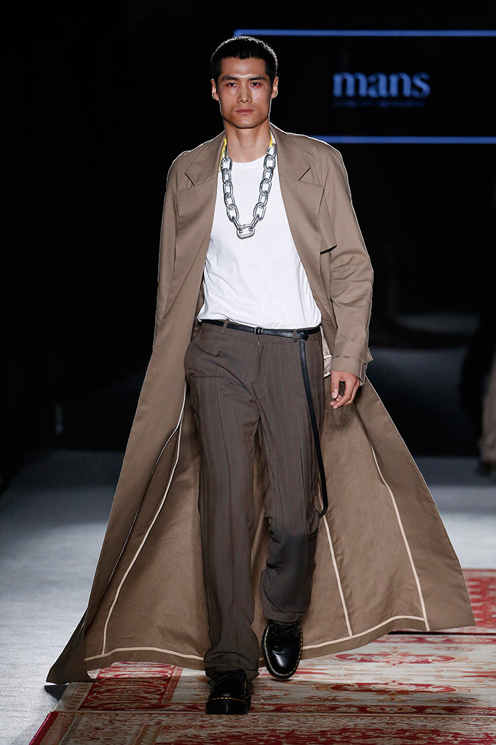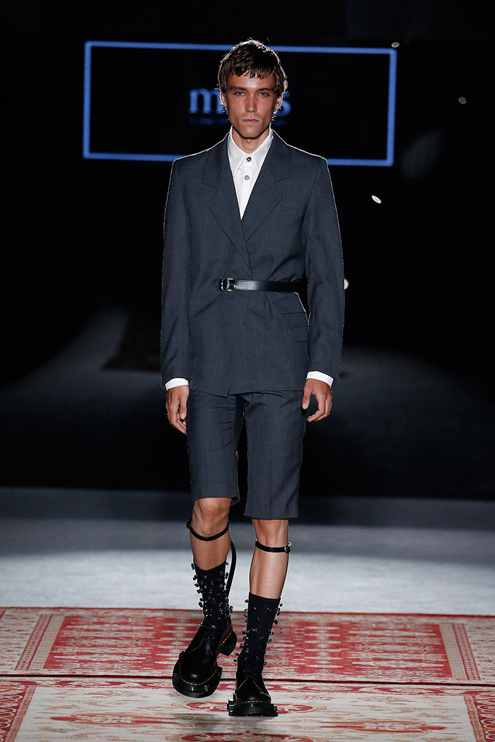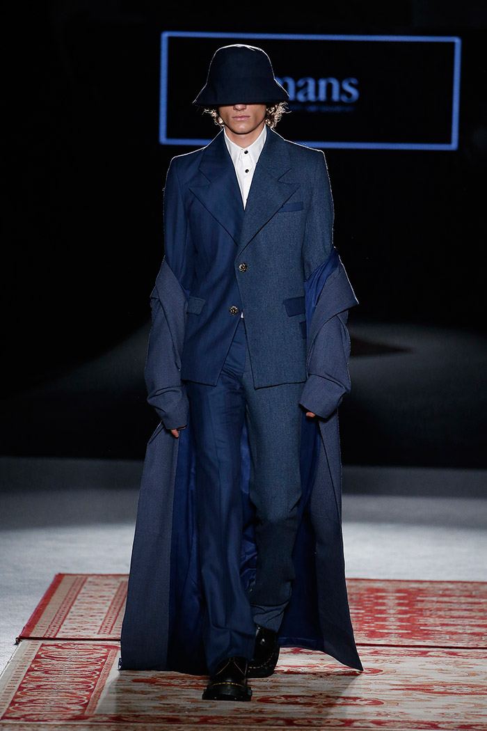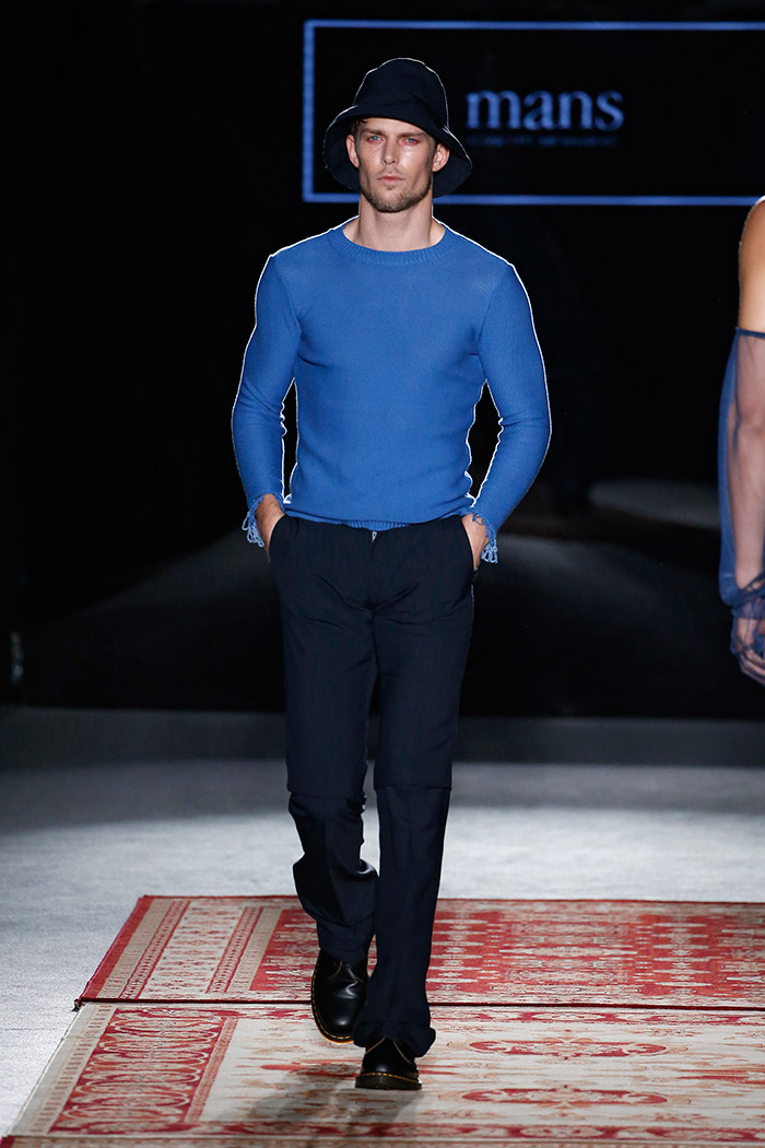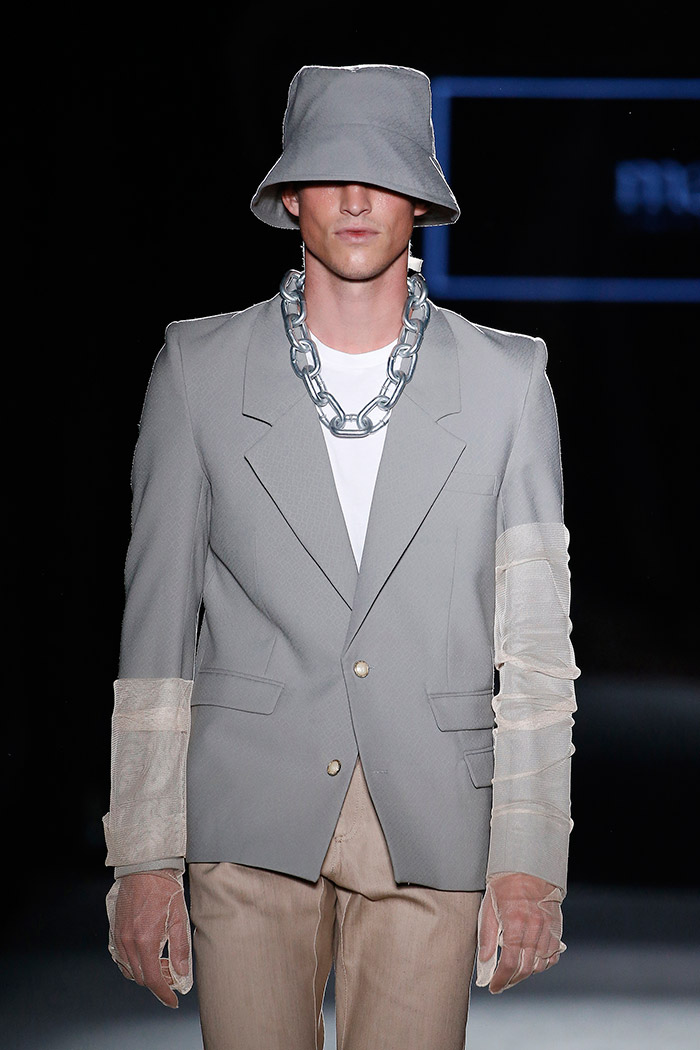 El rastro de las raves queda en el maquillaje en los ojos enrojecidos de los modelos pero, en lo concerniente a este uniforme clubber, la base primordial es la sastrería en una aproximación que toma a Thom Browne y sube las apuestas por la vía de la liberación del formato tres piezas habitual en el traje: aquí un «traje» puede vestir sin necesidad de chaqueta, substituyéndola por un chaleco en versión maximalista o por una camiseta sin mangas que conserva el alma del traje simple y llanamente en el tejido. Las prendas de punto y de sporstwear aparecen en la colección como puntos de fuga que incluso dejan a la vista partes desnudas del cuerpo masculino. Los abrigos de Mans Concept & Menswear llegan hasta el suelo y caen con una feminidad que se introduce en el resto de la colección como un virus empeñado en socavar la masculinidad del siglo XX y abrirle paso hacia el siglo 21.