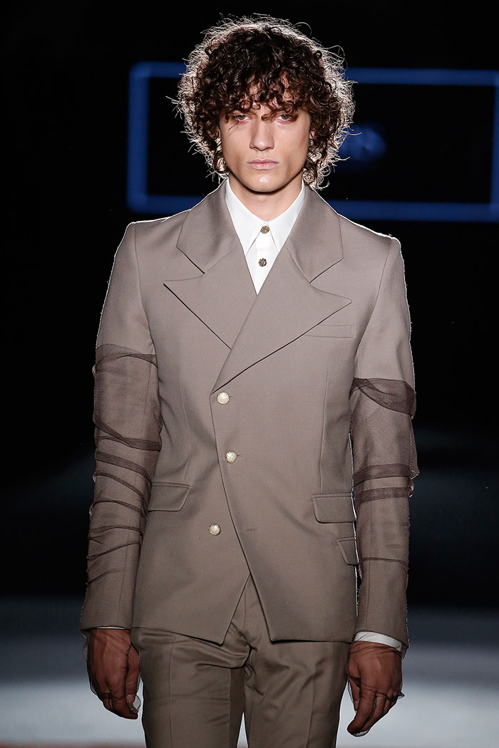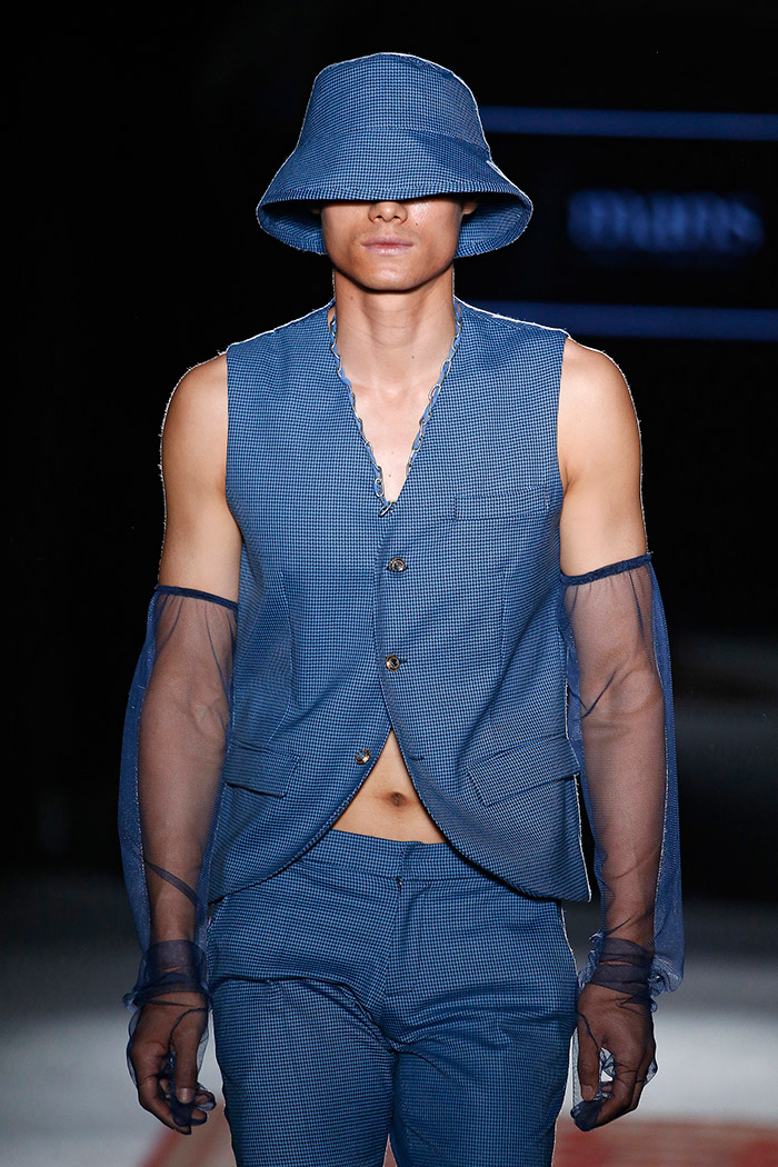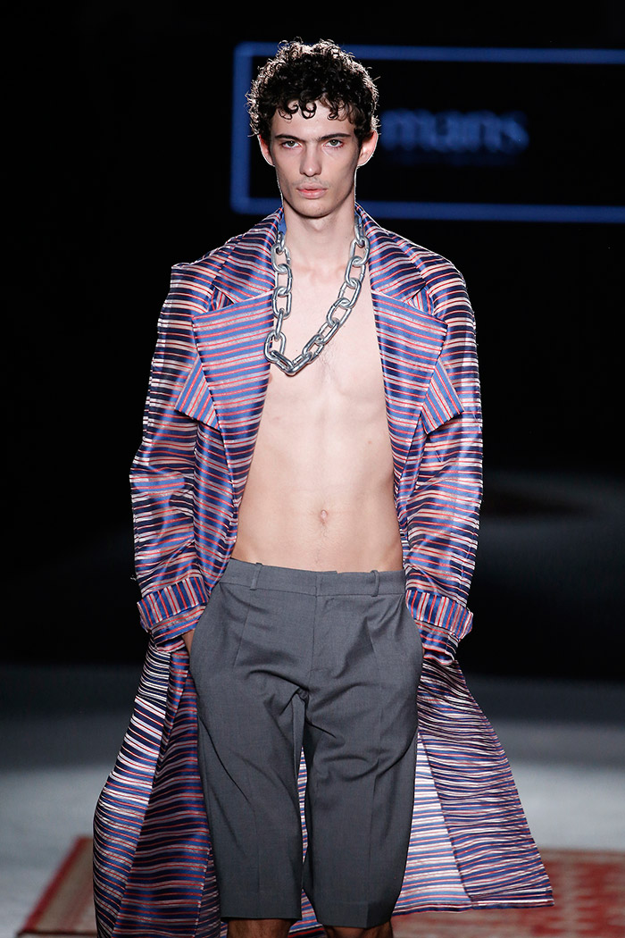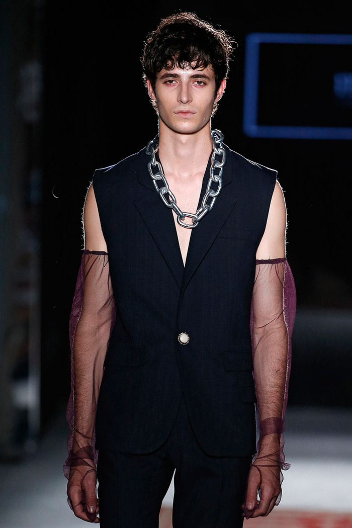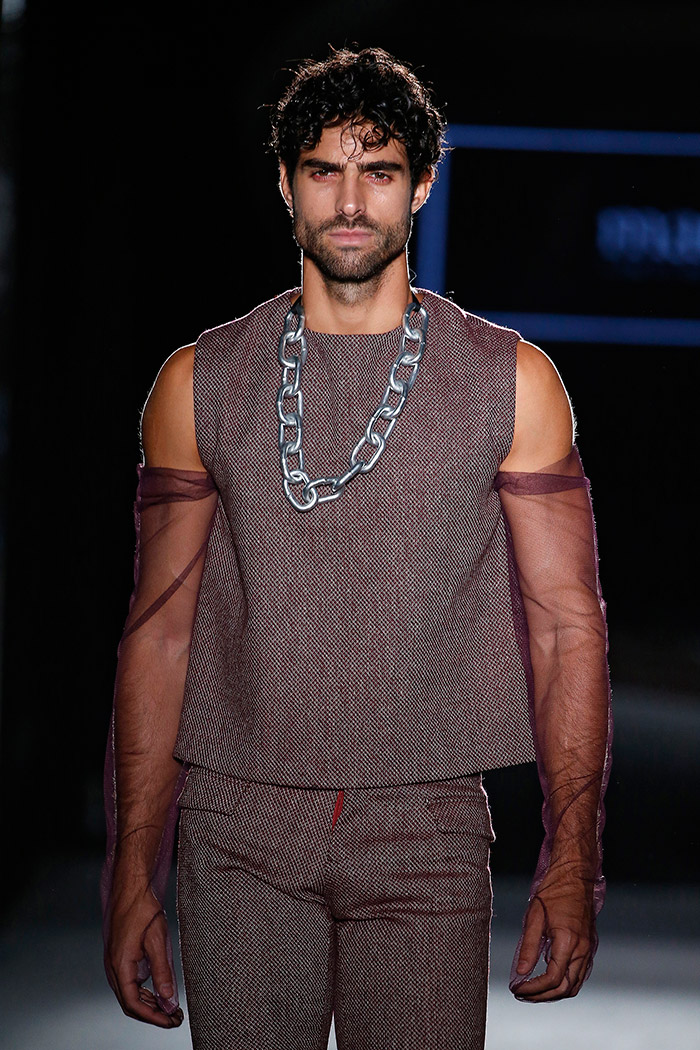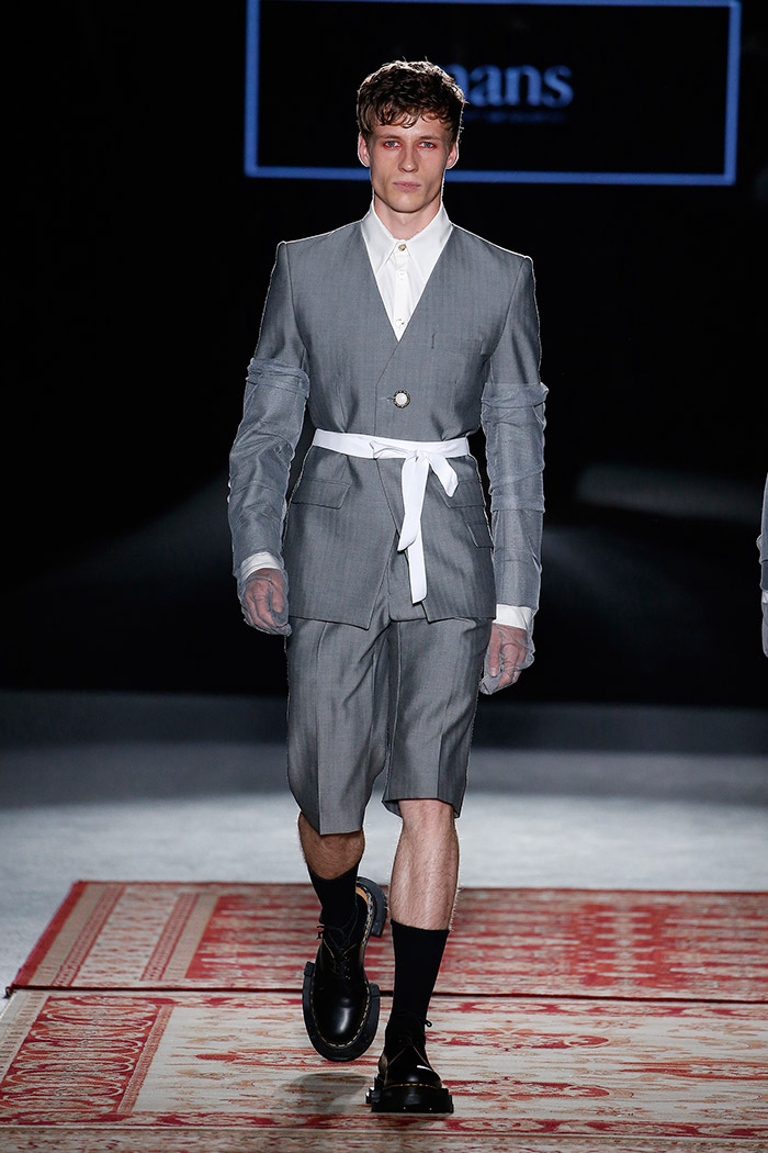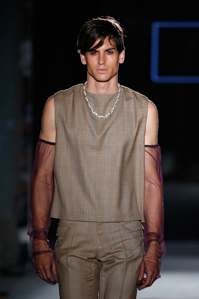 El rastro de las raves queda en el maquillaje en los ojos enrojecidos de los modelos pero, en lo concerniente a este uniforme clubber, la base primordial es la sastrería en una aproximación que toma a Thom Browne y sube las apuestas por la vía de la liberación del formato tres piezas habitual en el traje: aquí un «traje» puede vestir sin necesidad de chaqueta, substituyéndola por un chaleco en versión maximalista o por una camiseta sin mangas que conserva el alma del traje simple y llanamente en el tejido. Las prendas de punto y de sporstwear aparecen en la colección como puntos de fuga que incluso dejan a la vista partes desnudas del cuerpo masculino. Los abrigos de Mans Concept & Menswear llegan hasta el suelo y caen con una feminidad que se introduce en el resto de la colección como un virus empeñado en socavar la masculinidad del siglo XX y abrirle paso hacia el siglo 21.