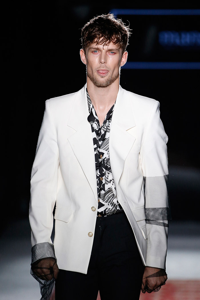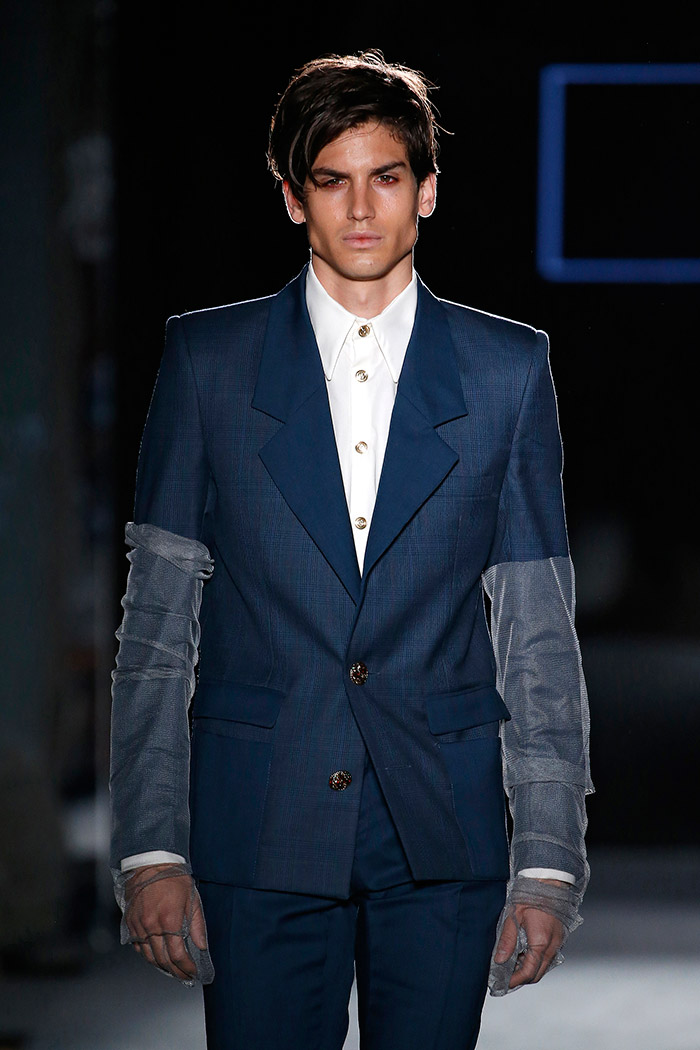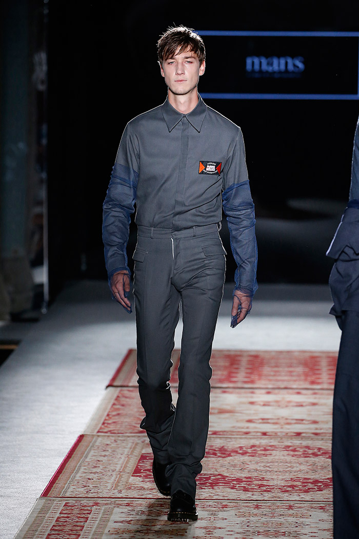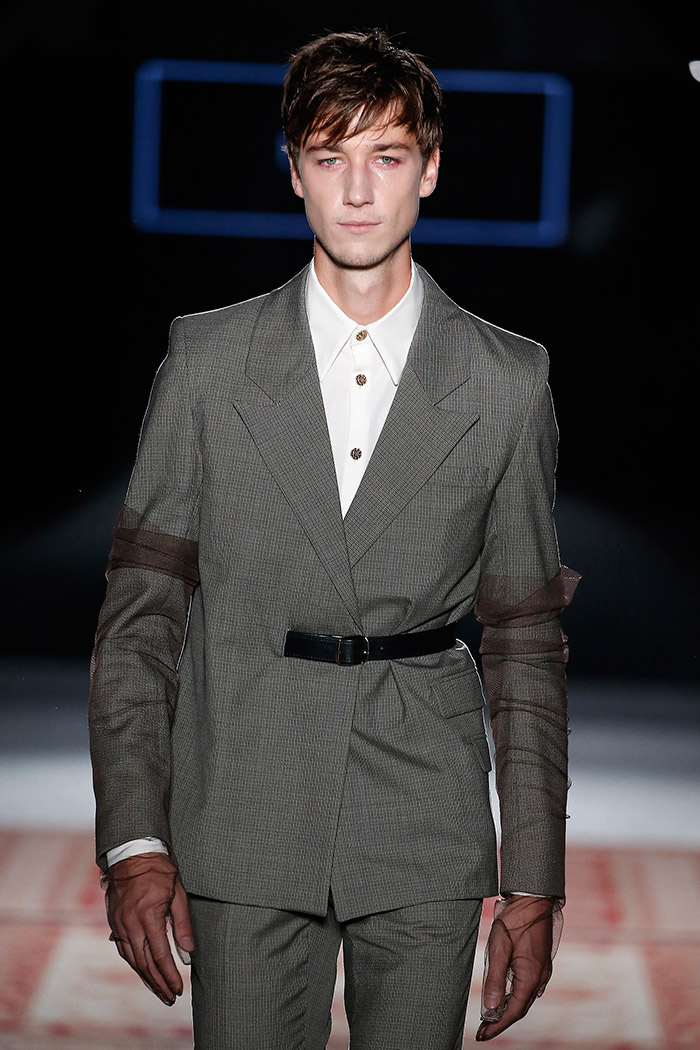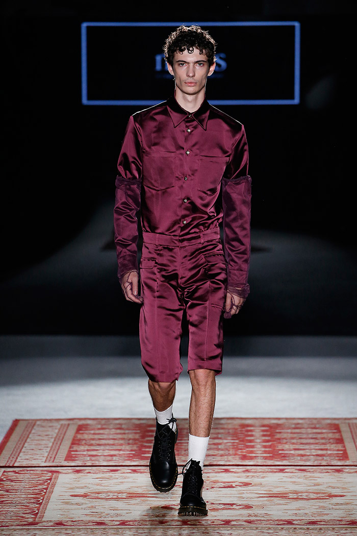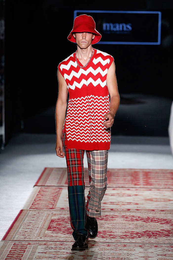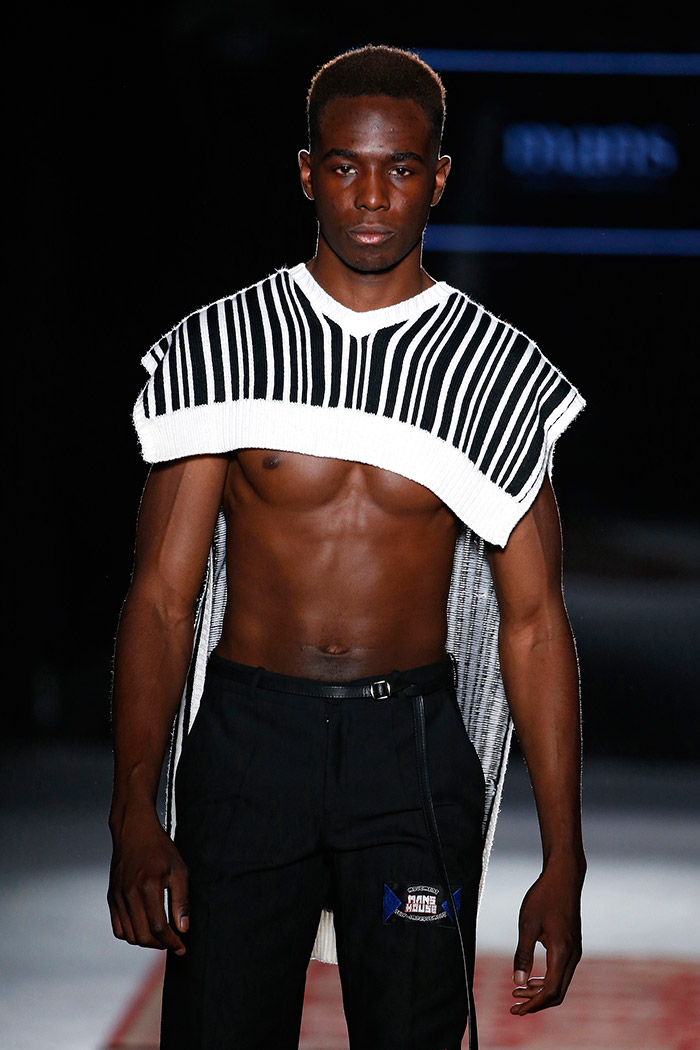 El rastro de las raves queda en el maquillaje en los ojos enrojecidos de los modelos pero, en lo concerniente a este uniforme clubber, la base primordial es la sastrería en una aproximación que toma a Thom Browne y sube las apuestas por la vía de la liberación del formato tres piezas habitual en el traje: aquí un «traje» puede vestir sin necesidad de chaqueta, substituyéndola por un chaleco en versión maximalista o por una camiseta sin mangas que conserva el alma del traje simple y llanamente en el tejido. Las prendas de punto y de sporstwear aparecen en la colección como puntos de fuga que incluso dejan a la vista partes desnudas del cuerpo masculino. Los abrigos de Mans Concept & Menswear llegan hasta el suelo y caen con una feminidad que se introduce en el resto de la colección como un virus empeñado en socavar la masculinidad del siglo XX y abrirle paso hacia el siglo 21.