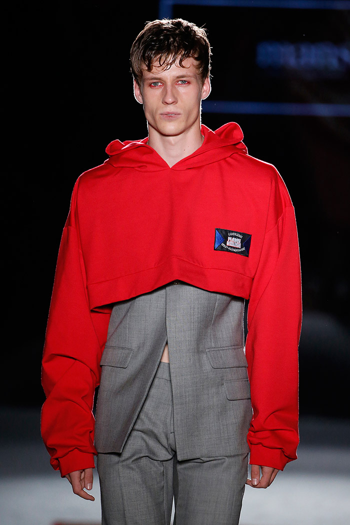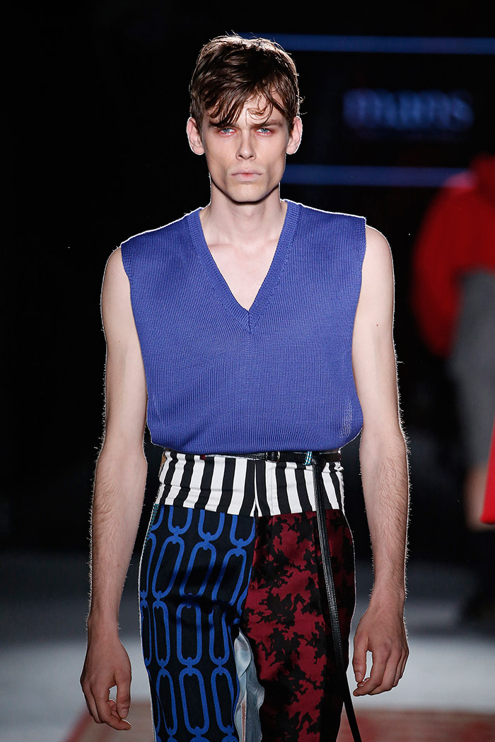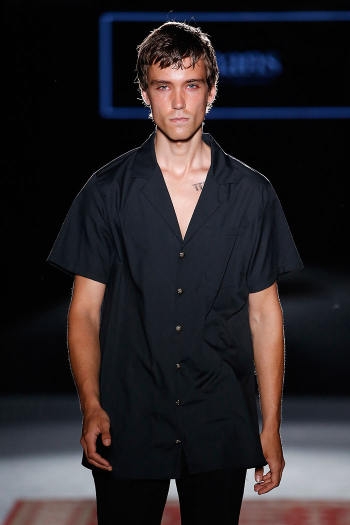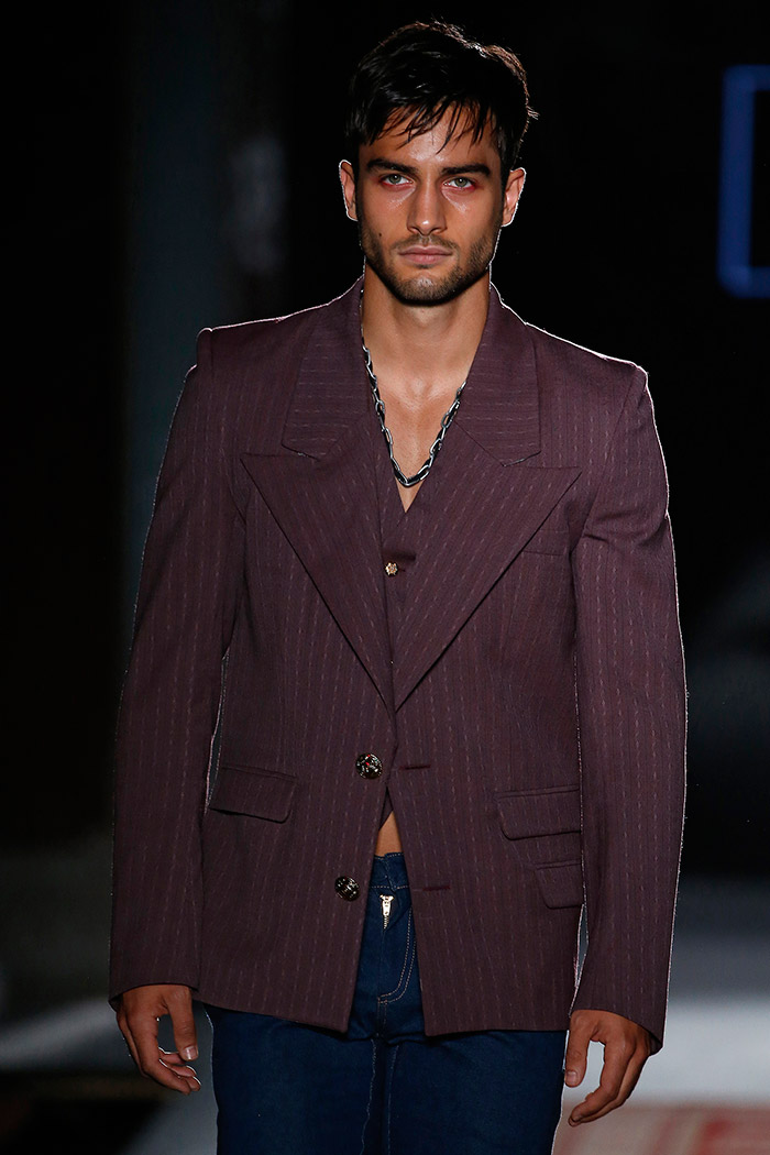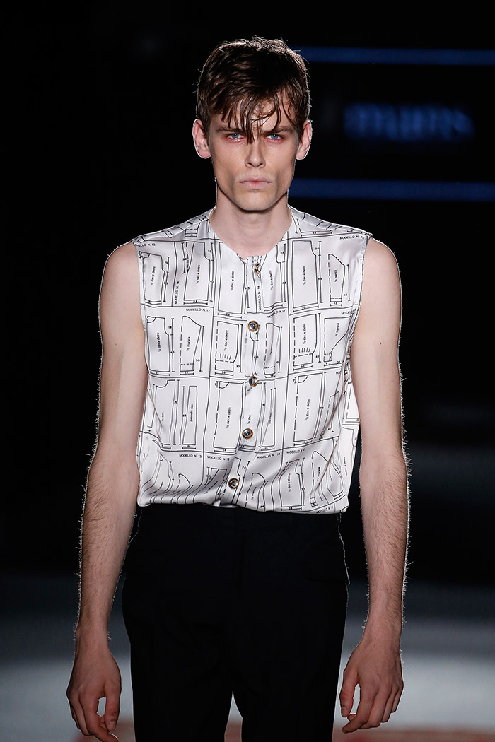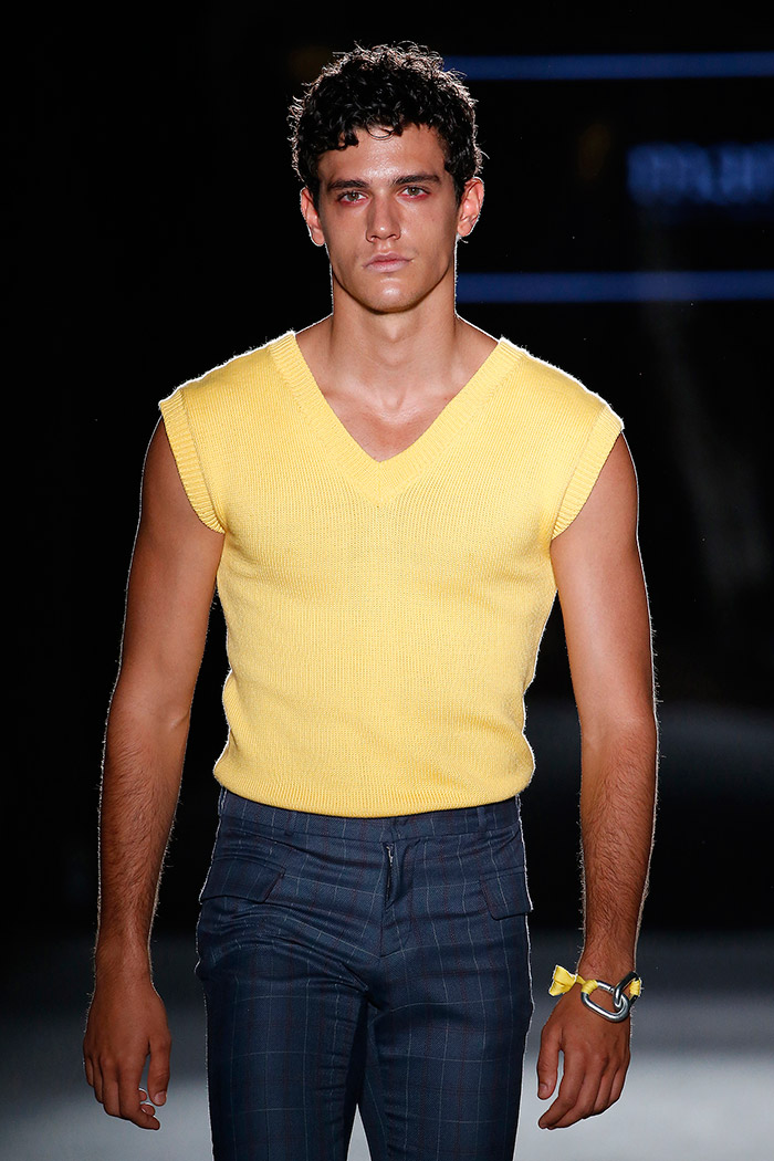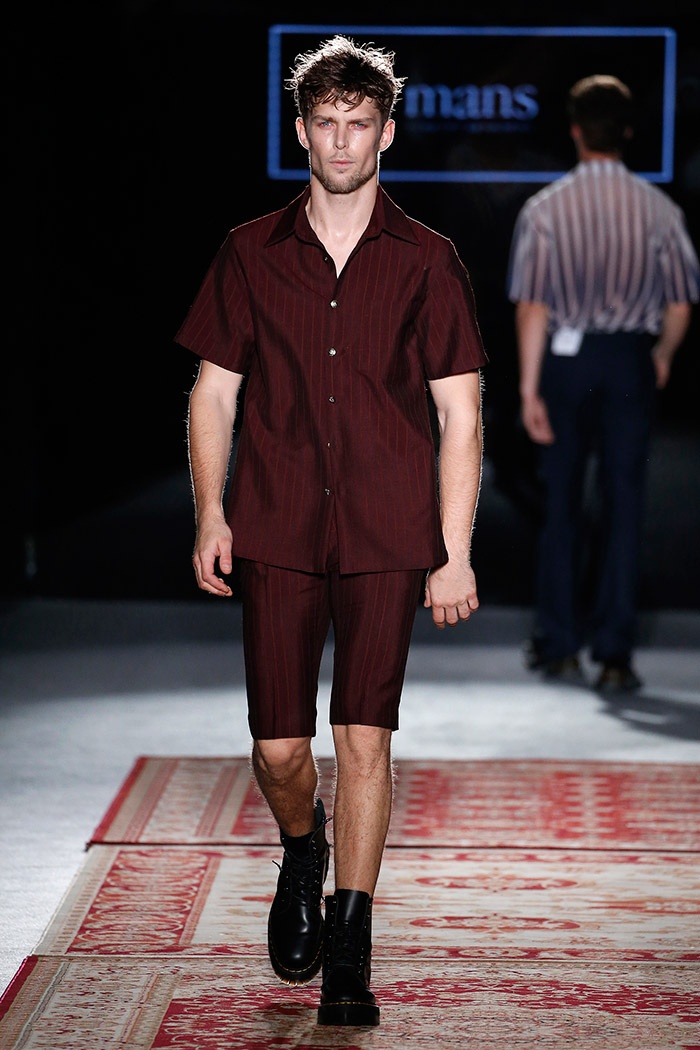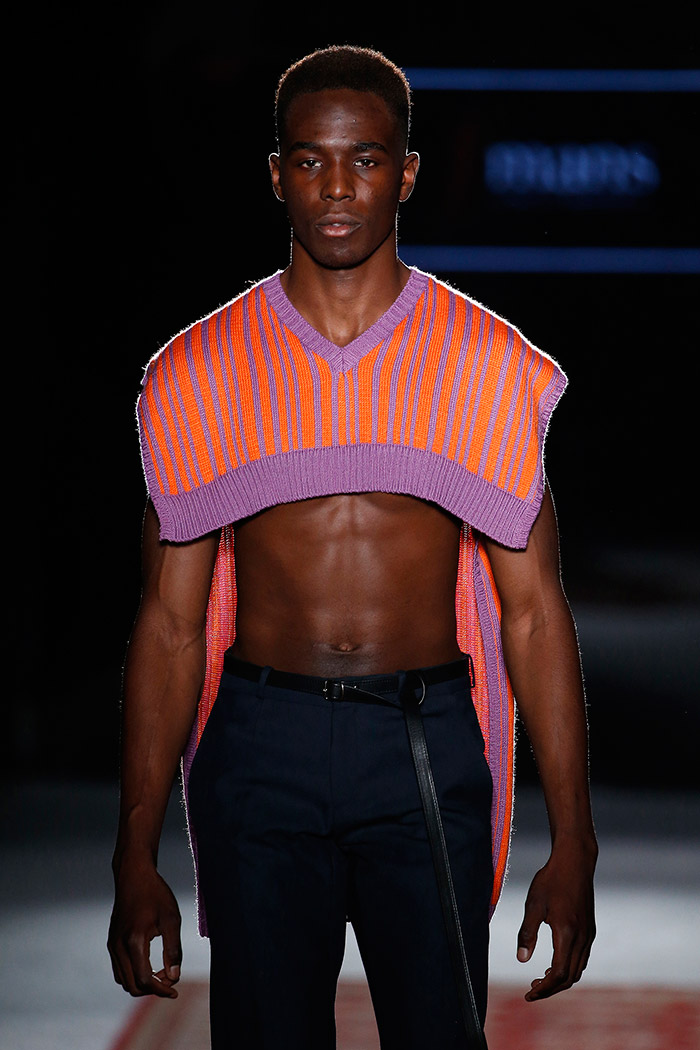 El rastro de las raves queda en el maquillaje en los ojos enrojecidos de los modelos pero, en lo concerniente a este uniforme clubber, la base primordial es la sastrería en una aproximación que toma a Thom Browne y sube las apuestas por la vía de la liberación del formato tres piezas habitual en el traje: aquí un «traje» puede vestir sin necesidad de chaqueta, substituyéndola por un chaleco en versión maximalista o por una camiseta sin mangas que conserva el alma del traje simple y llanamente en el tejido. Las prendas de punto y de sporstwear aparecen en la colección como puntos de fuga que incluso dejan a la vista partes desnudas del cuerpo masculino. Los abrigos de Mans Concept & Menswear llegan hasta el suelo y caen con una feminidad que se introduce en el resto de la colección como un virus empeñado en socavar la masculinidad del siglo XX y abrirle paso hacia el siglo 21.
