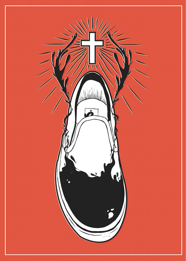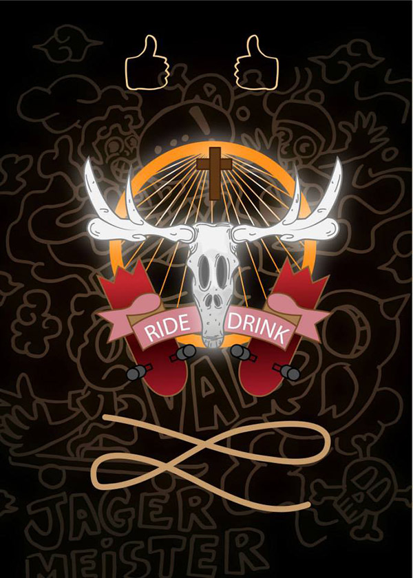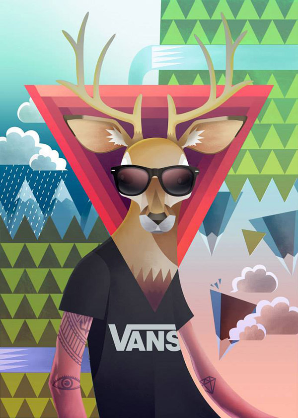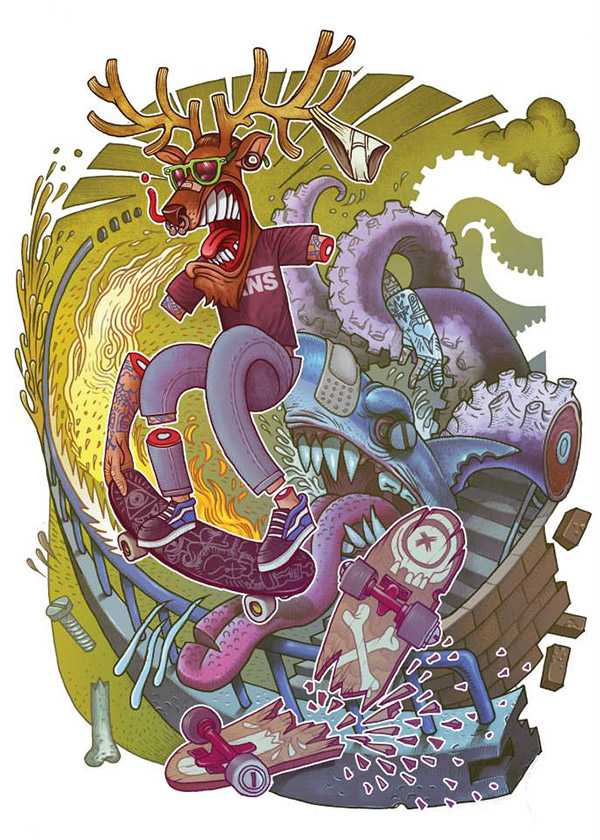 Sea como sea, y tal y como os explicábamos hace unas semanas en esta noticia, este choque de gigantes (al que hay que sumar, por cierto, al IED) ha tenido como consecuencia una de las acciones más impactantes visualmente de la temporada… El punto de partida ya lo había preparado todo para que así fuera: la idea era que los concursantes en este Vans x Jägermeister Creative Contest enviaran una imagen en la que los espíritus de ambas marcas se trenzaran de la forma más armónica posible. El resultado fue tan tremendo que los chicos de ambas firmas decidieron montar una exposición con todos los finalistas (que puedes ver encabezando este post y en la galería más abajo).