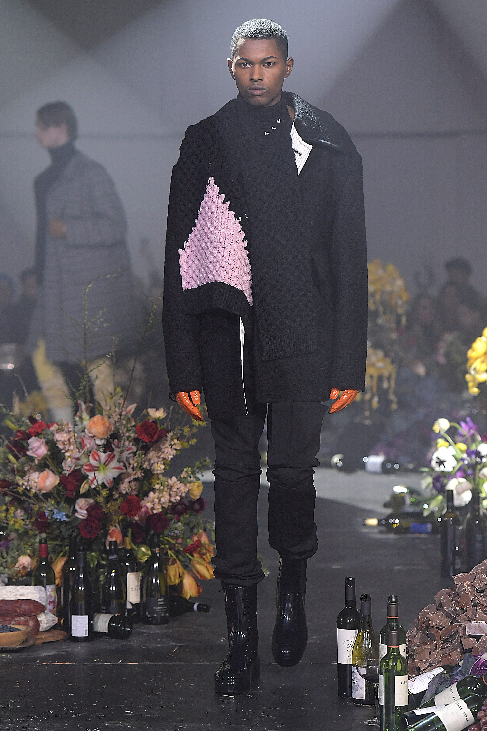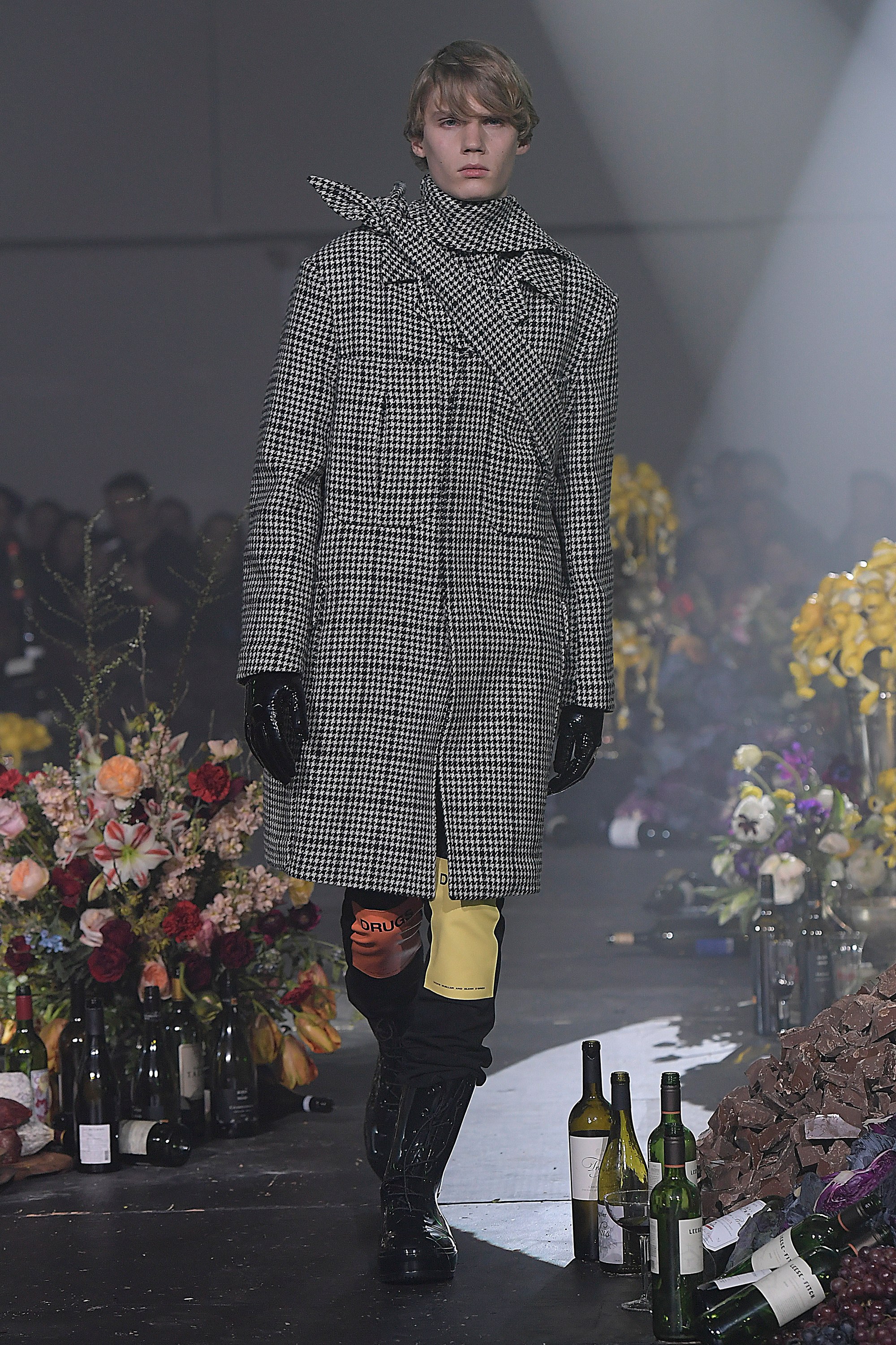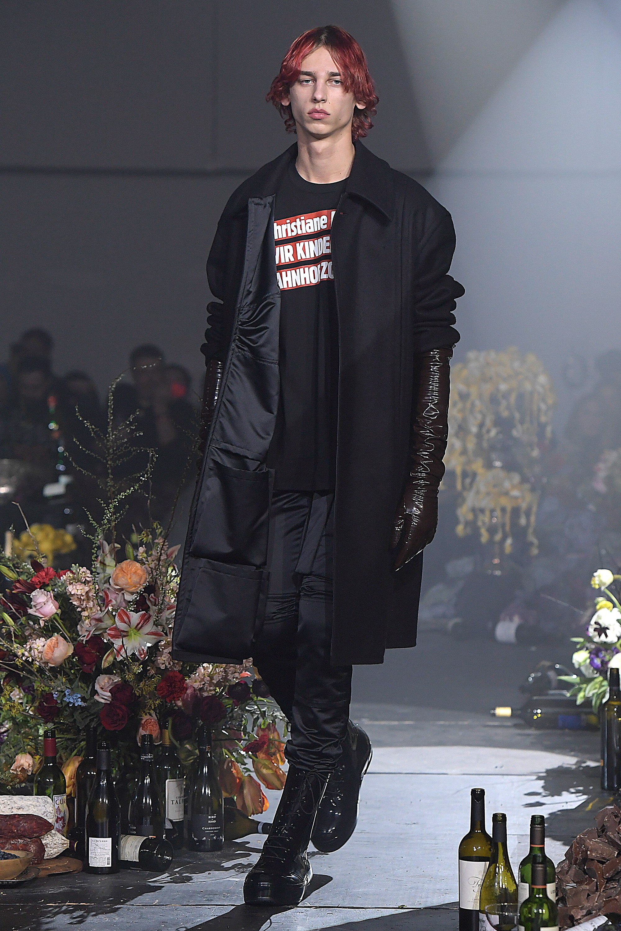 Raf Simons presentó su nueva colección en la reciente New York Fashion Week bajo el sugerente nombre de «Youth in Motion«… Y, de hecho, por si el título no resultaba lo suficientemente gráfico, la pasarela sobre la que desfilaron los modelos estaba bordeada por un verdadero festín de decadencia alemana: flores, chocolate, uvas y un sinfín de botellas de vino medio vacías hacían pensar en el panorama del día después de una bacanal. Dicho de otra forma: el propio escenario en el que se presentó «Youth in Motion» escenificaba la resaca que sigue a toda buena noche de desenfreno y exceso.