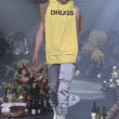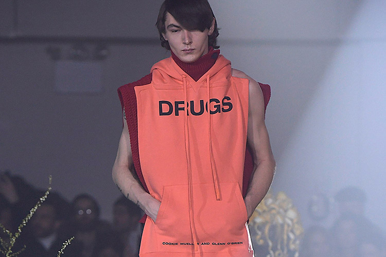 La segunda referencia podría parecer más frontal… Pero no lo es. Algunos pueden pensar que eso de poner parches en algunas prendas con palabras domo «Drugs«, «LSD«, «XTC» o «GHB» no podría ser menos sutil. Pero es que resulta que estos parches son una reproducción directa de la portada de la obre de teatro «Drugs» de Cookie Mueller y Glenn O’Brien, en la que ambos autores dejaron constancia de sus propias aventuras lisérgicas durante los treinta años que van desde el LSD de los 60 hasta a los opiáceos de los 80.