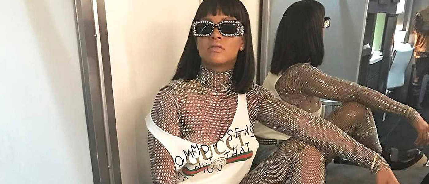 Porque, a ver, ¿cómo de fuerta hay que ser para plantarse en el punto de reunión del coolness mundial enfundada en una maya corporal de brilli brilli coronada por unas gafas de sol gigantes, unos mini shorts vaqueros raídos y una camiseta… ¿de Gucci? Sí, de Gucci. Has leído bien. De hecho, es la camiseta de Gucci que luce las letras escritas por la española Coco Capitán. Y es que, al fin y al cabo, ahí estaba la trampa y la gracia de la jugada de Rihanna: en que era una reproducción totalmente fiel a uno de los últimos looks de Alessandro Michelle para Gucci.