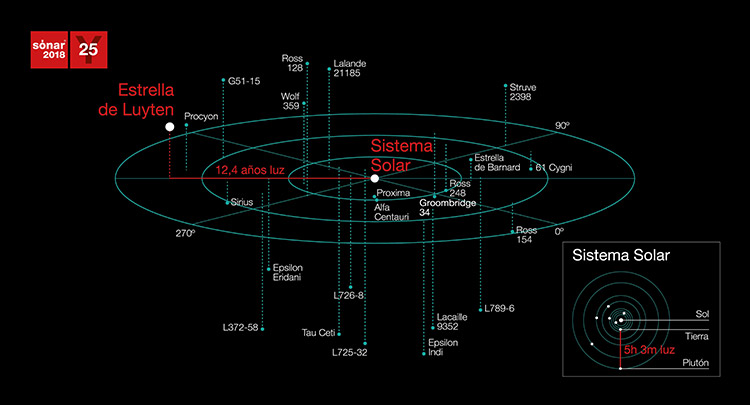 Dicen desde el Sónar que llevan 25 años rastreando los sonidos más avanzados a lo largo y ancho de planeta Tierra y que, por lo tanto, quieren descorchar su 25 Aniversario haciendo lo mismo pero en diferente lugar. Dicho de otra forma: que van a rastrear el universo a la búsqueda de inteligencia extraterrestre. Seguramente, en los últimos días ya hayas visto el hashtag #GJ273b pululando por las redes sociales… Pues, bien, resulta que este tinglado se refiere a Luyten, la estrella más cercana con un exoplaneta potencialmente habitable conocido que es visible desde el Hemisferio Norte. Y resulta también que entre los días 16 y 18 de octubre, el Sónar ya ha enviado todo un conjunto de mensajes radiofónicos en dirección hacia este planeta.