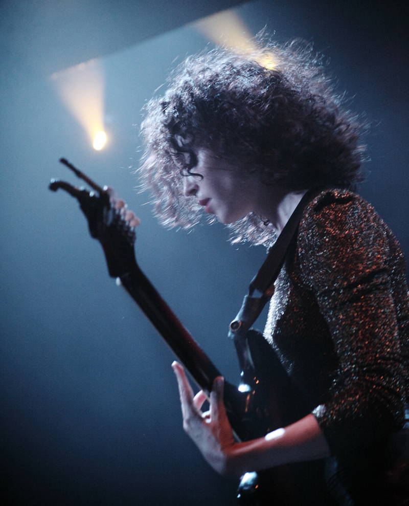 Ella, tan mona, tan menuda y con cara de no haber roto un plato, los rompe, y grita, y toca la guitarra de una manera indecente, pero siempre sin ser vulgar y sin perder una feminidad que, precisamente por mostrar ese lado más salvaje, aparece con más fuerza. Empezó su show con «Marrow«, de su anterior disco «Actor» (4AD, 2009), dando a ratos pasitos estilo “las muñecas de famosa” mostrando esa fragilidad que aparenta su físico pero que no se encuentra en su alma de rock star, tal y como demostró durante todo el concierto. Riffs descontrolados con minucioso control, ruido, distorsión y unas manos prodigiosas que nos obsequiaron con más canciones de su último disco, «Strange Mercy» (4AD, 2011), que cualquiera de los anteriores, «Actor» y «Marry Me» (Blanco y Negro, 2007), tal y como «Cheerleader» y la coreada «Cruel«, «Chloé in the Afternoon» o esa «Dilettante» dedicada a Nueva York, la ciudad que la adoptó cuando decidió hacer las maletas e irse de un pequeño pueblo de Dallas a la gran ciudad a buscarse la vida con la música.