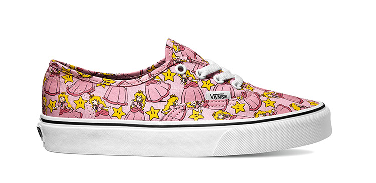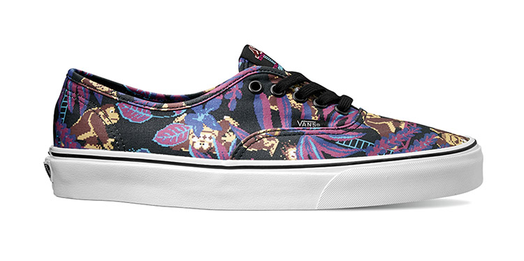 De esta forma, encontramos zapatillas, ropa y accesorios en cinco variaciones… La primera de ellas homenajea el mundo de Super Mario Bros con un print que te invita a viajar al Mushroom Kingdom bien rodeado de Goombas. La segunda fascina con su estampado a mayor gloria de la princesa Peach, siempre dispuesta a ser raptada. La tercera variación ya se aleja del mundo de Mario para explorar el de Zelda. La cuarta variación celebra a Donkey Kong mientras que la quinta apuesta por un juego menos conocido: «Duck Hunt«. Y, por último, también existe una sexta variación centrada en la imaginaría del mundo más clásico de Nintendo.
