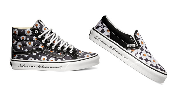 Y lo que ha conseguido captar nuestro interés (y que lo apuntemos en la lista de las cosas del querer… pero del querer comprar) ha sido una edición especial que Vans ha preparado para el 14 de febrero (que los skaters también tienen su corazoncito, a ver qué os habéis pensado): la «He loves me, he loves me not«, una edición chulérrima que se sale del cliché de los corazoncitos y el rojo y apuesta por un print de margaritas y la eterna duda escrita con caligrafía manual en el lateral de la suela. Estará disponible en dos modelos de zapatillas: la Ski8-Hi Slim (bota tobillera, formato ochentero) y la Classic Slip On (el diseño clásico de Vans). Si sois de esas parejas pesadas que se hacen regalos y arrumacos tol rato, nos parece un presente original y molón y la excusa perfecta para decirle a tu tórtolo «quiéreme tonto… Y píllame una de estas, anda«.