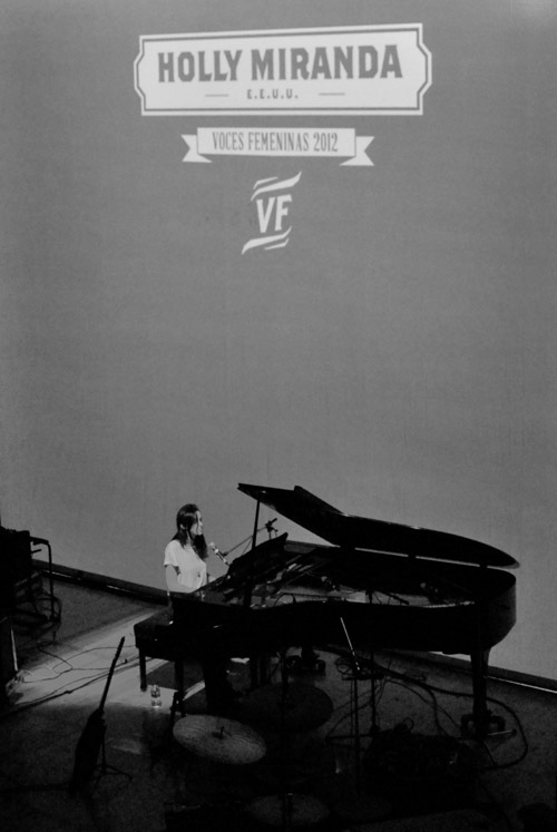 Con una enorme imagen de Nina Simone (esta de aquí) presidiendo el elegante decorado y su inconfundible voz creando una confortable atmósfera, todo estaba preparado para que se iniciase un viaje sonoro por los diversos espacios físicos y supra-terrenales que sugerían cada una de las invitadas de la noche. La primera en salir, una delgadísima Holly Miranda, parecía querer trasladar al respetable los aires espartanos y austeros de su ciudad de origen, Detroit. Sola, armada con su guitarra eléctrica, decidió cambiar el velo dream-pop y de psicodelia de algodón de “The Magician’s Private Library” (XL Recordings / PopStock!, 2010) por la coraza y firmeza sentimental de Cat Power o la mencionada Sharon Van Etten, más propias de los tiempos en su antigua banda, The Jealous Girlfriends. De esa época rescató una intensa “Carry Me”, que abrió la primera mitad de su intervención entre milimétricos y transparentes punteos guitarreros, en la que destacó su revisión de “Nobody Sees Me Like You Do” de Yoko Ono. Con todo, su economía de recursos no le impedía dotar de emoción a sus palabras para transmitirlas inmaculadas y dulcificadas al público, sobre todo cuando se sentó al piano: ante sus teclas, transformó en terciopelo de cristal la inédita “Everlasting” o “Everytime I Go To Sleep”, a la que unió la breve “Hymnal”, culminada con el agudo de su hechizante voz elevado al cielo, sublime resumen del modo en que había desnudado su repertorio y su alma durante su show.