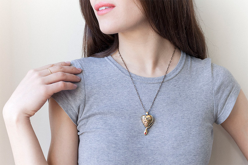 Es este un colgante en forma de corazón donde aperecen escarbadas las palabras «The Wild Heart» y en el que la punta inferior de este músculo sin el que no podríamos vivir es una especie de cola en la que va engarzado un brillante de color rojo sangre. La pieza está disponible en dos modelos, uno en bronze y otro en plata, incluyendo ambos una cadena de 50 cms. Y la verdad es que las fotos que acompañan a esta noticia nos han dado una noticia más que interesante: ¿se te ocurre mejor idea para este San Valentín que las dos partes de tu pareja vistáis esta joya en dos versiones diferentes? A nosotros no, la verdad.